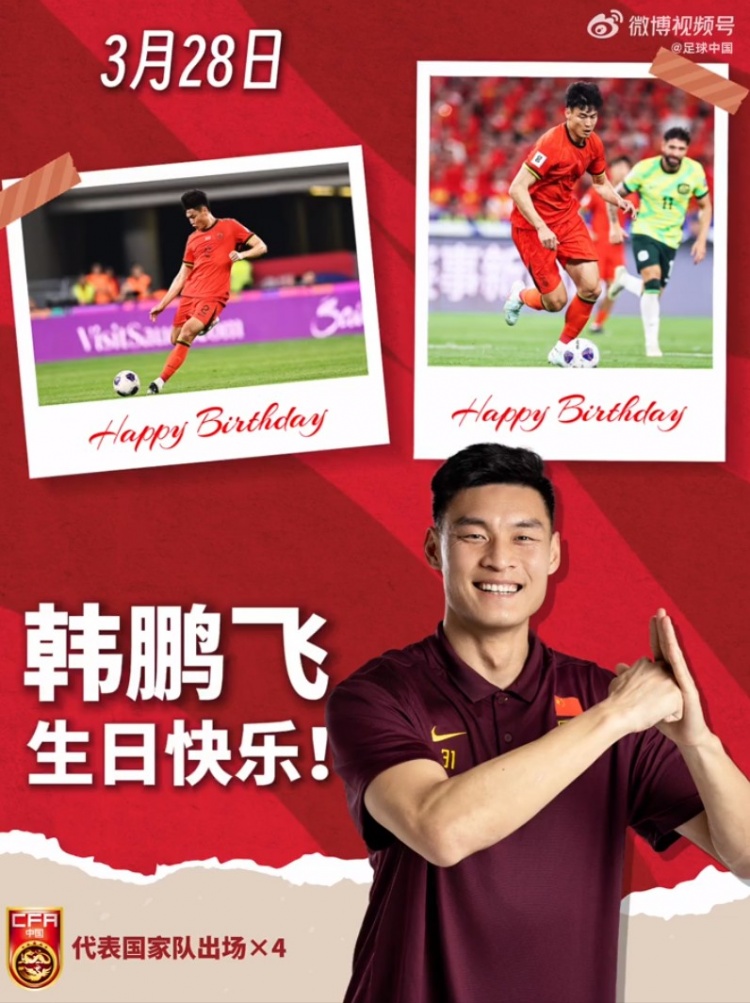 3月28日讯 今天是韩鹏飞33岁的生日,“足球中国”官方写道:你是后防的“钢铁侠”!祝韩鹏飞生日快乐,继续用实力守护绿茵梦想,收获更多荣耀!