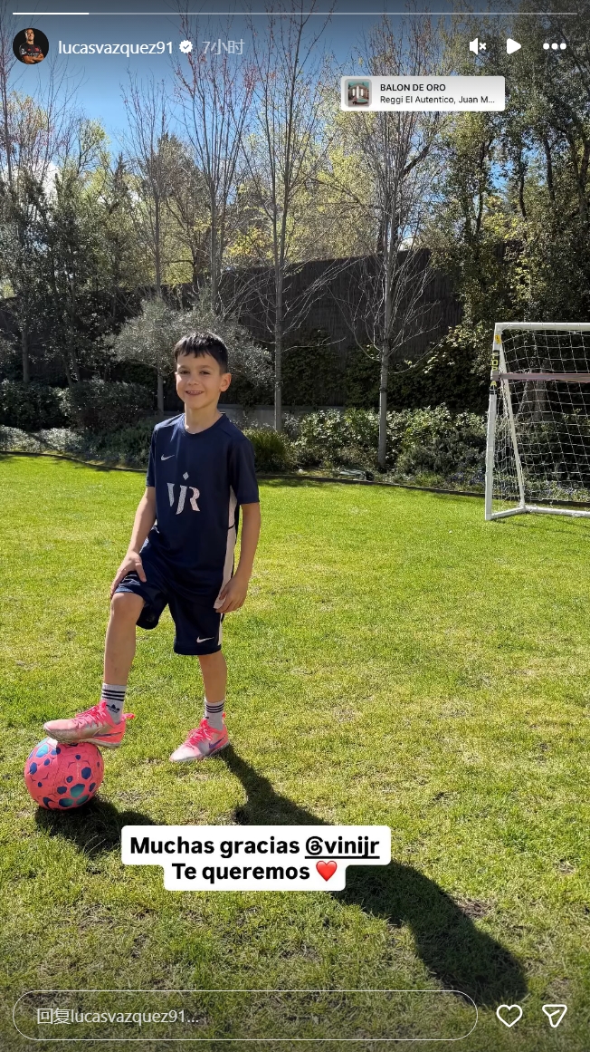 巴斯克斯社媒晒出孩子身穿维尼修斯赠送的球衣的照片,配文:“非常感谢维尼修斯,我们爱你。”